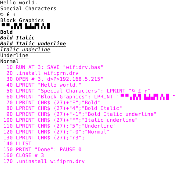 - Printing ZX Spectrum special characters (©, £, ↑, ▝, ▘, ▀, ▗, ▐, ▚, ▌, ▛, ▄, ▟, ▙, █)