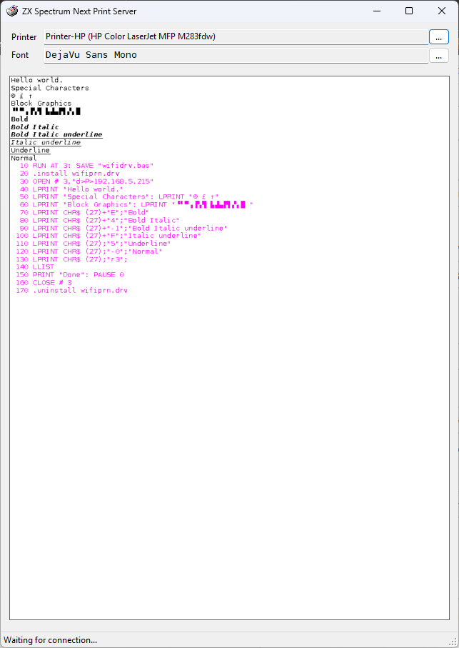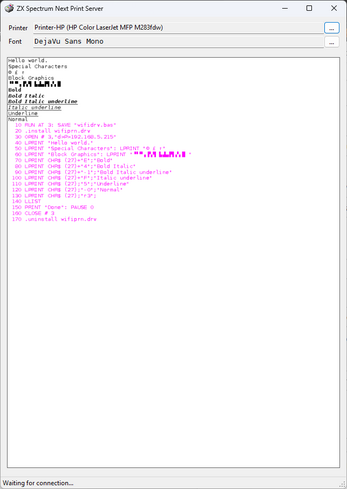 If your printer doesn’t support direct RAW printing, or if you’re looking for a more advanced printing experience, consider running the NextPrintServer. When paired with the WIFI Printer Driver on the ZX Spectrum Next, it unlocks a significantly richer feature set and improved functionality.